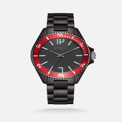 ساعه بتصميم عصري بسير من الخشب باللون البني الغامق ، تتميز الساعه بالميناء باللون الأسود وبإطار عريض وبارز كعداد للدقائق ، ساعة جذابه ومختلفه مصممه بطريقه أنيقه تناسب كل رجل عصري ، هذه الساعه هي الإختيار الأول لكل رجل يبحث عن إطلاله يوميه كلاسيكيه أنيقه ومميزه