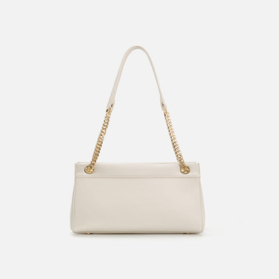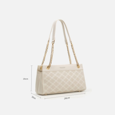 شنطة من الجلد المنقوش بشعار الماركه باللون الأبيض ، شنطة بتصميم عملي لإطلاله عمليه لكل يوم ، صممت الشنطه بحجم مناسب يكفي لكل إحتياجتك اليوميه بيد مقوسه علويه من المعدن بتصميم سلسال عريض ومن الجلد، تتميز الشنطة بسحاب اغلاق وبتقسيم داخلي لجزئين لترتيب اغراضك بطريقه مرتبه ولسهوله الوصول لها ، شنطه بمقاس الطول= 26سم - العرض= 10 سم - الارتفاع= 19 سم ، نسقي الشنطه مع اطلالتك اليوميه.